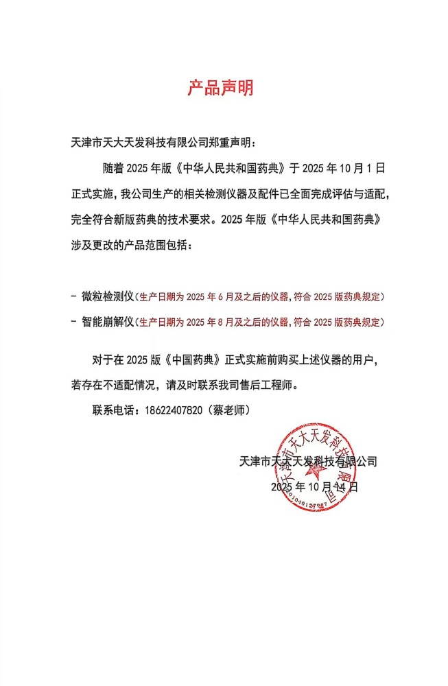 | 尊敬的各界朋友們: 歡迎您進入天津市天大天發(fā)科技有限公司的網站進行瀏覽,首先感謝各界朋友多年來對天大天發(fā)藥品檢測儀器和分析儀器的關心與支持! 天津市天大天發(fā)科技有限公司是通過ISO9001質量管理體系認證、ISO14001環(huán)境管理體系的認證的高新技術企業(yè),是專業(yè)的藥檢儀器和分析儀器的制造廠商。 我們的產品包括藥品溶出儀系列、微粒檢測儀系列、內毒素檢查儀系列等40余種產品,主要產品覆蓋了全國所有省區(qū),部分產品已進入海外市場。公司在藥檢領域樹立了良好的品牌形象,贏得了廣大用戶的贊譽。 公司將更好地適應瞬息萬變的市場,增強企業(yè)的核心競爭力。抓住全球經濟飛速發(fā)展的歷史性機遇,以創(chuàng)新精神進行新的創(chuàng)業(yè)。以高起點、高速度、高效率創(chuàng)造出中國藥品檢測儀器和分析儀器領域中的品牌形象,立足中國,走向國際。 我們熱切希望您成為天大天發(fā)科技有限公司的合作伙伴! |
